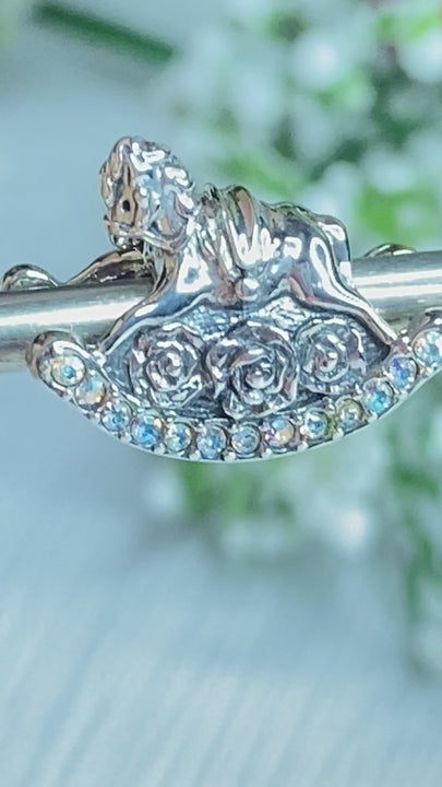 Carefully crafted from .925 sterling silver, this ornate charm features a row of Aurora Boreale crystals on either side of the rocking horse's legs.