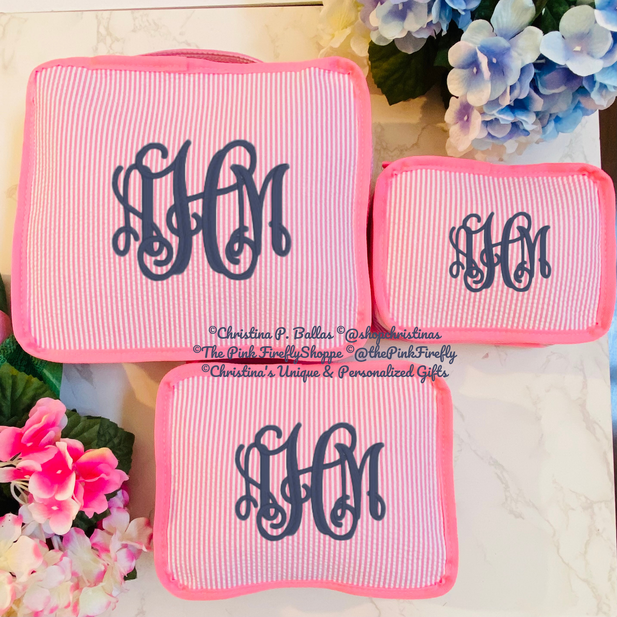 Travel in style with these embroidered Pink Seersucker Packing Cubes! 🌸💼