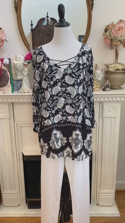 Embrace the elegance of the Simply Noelle Lotus Flower Top in Black/Teal. With a beautiful lotus flower design and a vibrant teal color, this top is perfect for any occasion.